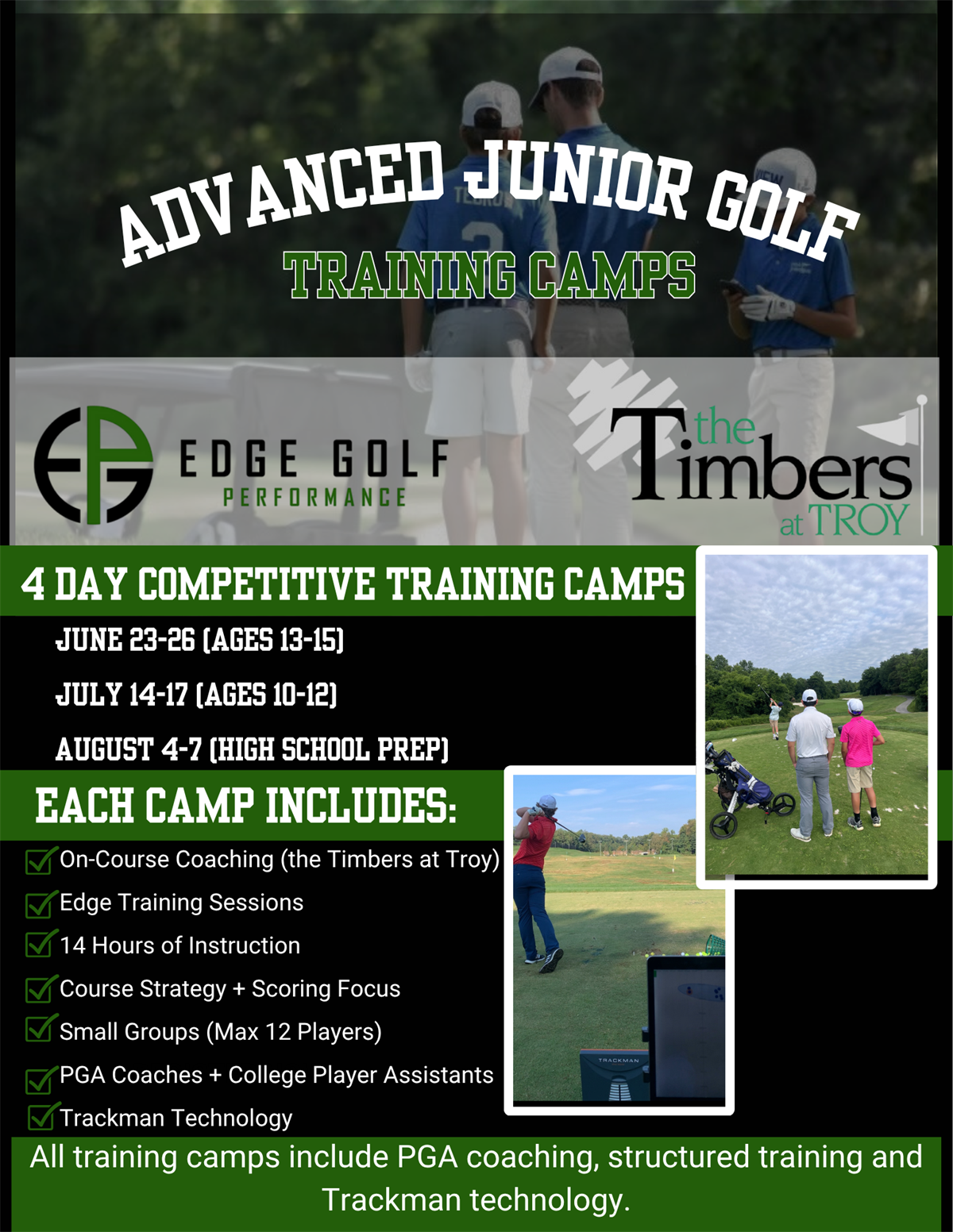 Advanced Junior Golf Training Camps are 4-day competitive training experiences designed for players looking to improve on-course performance, scoring ability, and overall consistency. Each camp combines on-course coaching at the Timbers at Troy with structured training sessions at Edge in a small group, high-level environment.